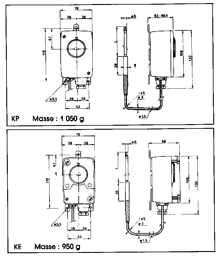 bulbo con capillare in rame protetto in guaina inox (KE, KP)